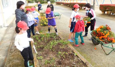 清掃の時間を利用して、花壇整備を行いました。今回は、サルビアやマリーゴールドの引き抜き作業です。まだ、咲いているものもありますが、春咲きのパンジーを植えるため、ちょっともったいないけれど、学校を彩ってくれた花々に感謝しつつ、思い切って抜きました。この後は、花壇に肥料を入れて土を整え、来月には苗植えとなります。