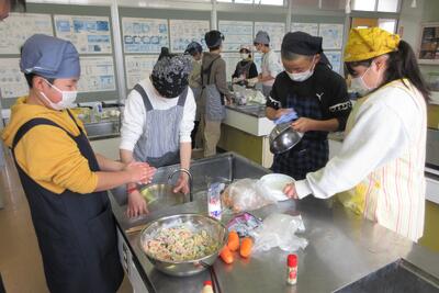 😄マカロニサラダグループ:材料を切ります。マカロニをゆでます。調味料を図り具と和えます。