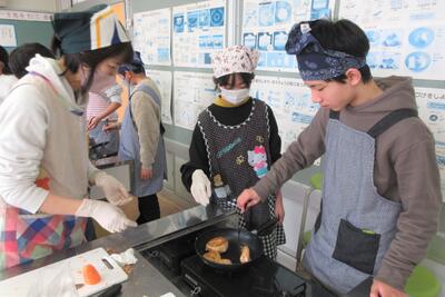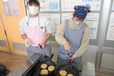 😄ツナのハンバーググループ:材料をみじん切りにします。ツナ缶の油の処理をします。こねて形を整えて焼きます。