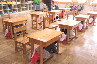 地震を想定して避難:机の下に隠れました。
